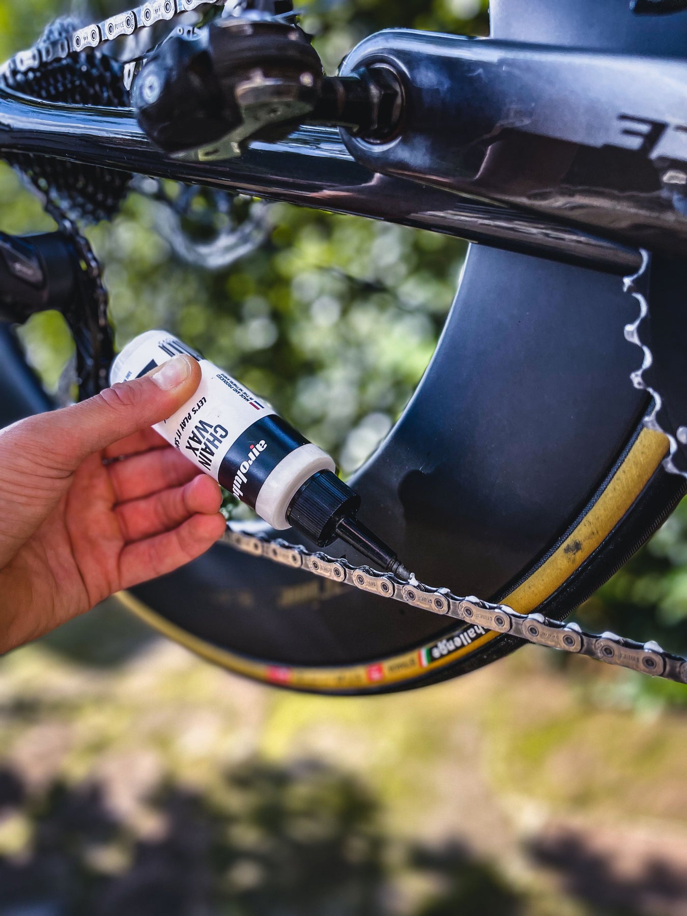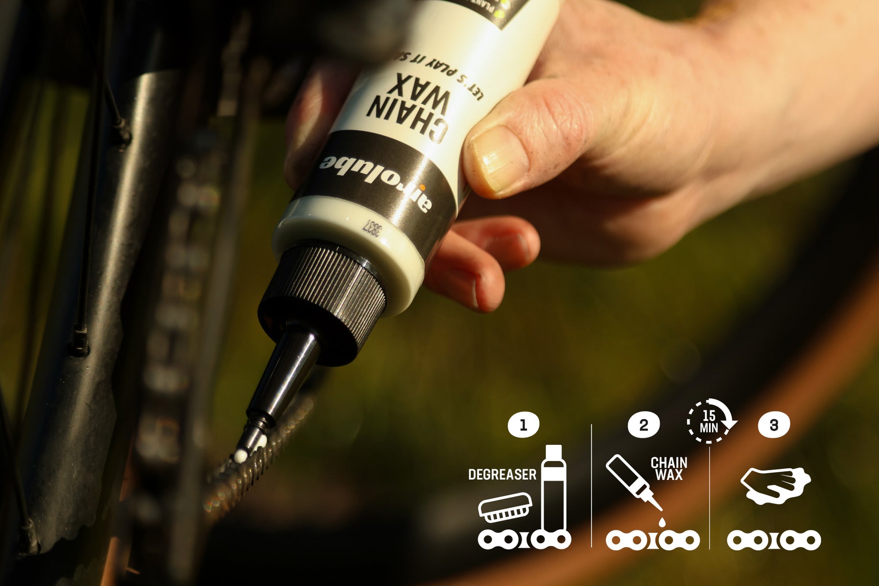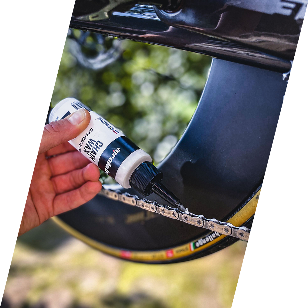 Our Chain Wax is specifically optimized for dry to slightly damp conditions. In these conditions, the chain remains exceptionally clean. Do you often ride in heavy rain or through deep mud? In that case, we recommend reapplying more frequently or choosing the Airolube All Season Wax, which is more resistant to being washed away.