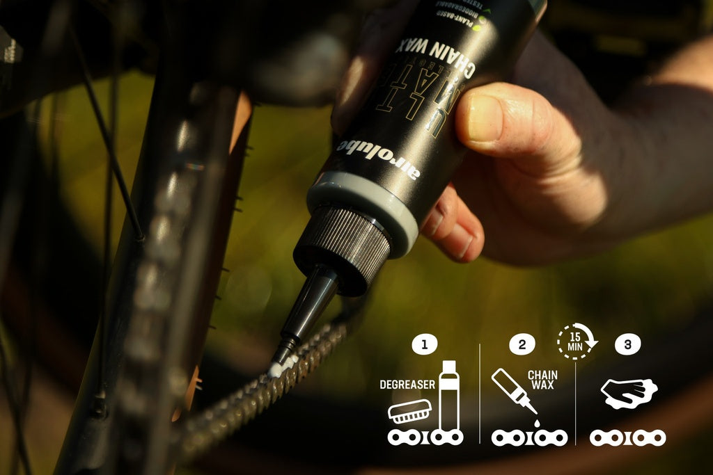 Voor de laagste weerstand moet de ketting volledig 'kaal' beginnen. Verwijder alle oude olie en vetresten met de Airolube Ultimate Chain Cleaner totdat het metaal volledig schoon is. Breng de Ultimate Chain Wax aan op een droge ketting en laat deze minimaal 2 tot 4 uur (bij voorkeur een nacht) uitharden voor een keiharde, snelle beschermlaag.